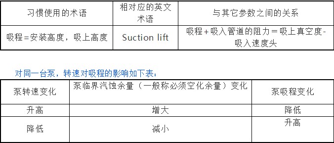 工業(yè)泵用戶一般要求泵的吸程(從吸入液面到泵吸入口的中心的垂直高差)高, 但國(guó)內(nèi)的泵標(biāo)準(zhǔn)及規(guī)范里,似乎沒(méi)有吸程這一術(shù)語(yǔ)。與它相關(guān)的術(shù)語(yǔ)是必須空化余量,約等于10-吸程(m, 沒(méi)有考慮吸入阻力)。我們認(rèn)為可以將吸程與國(guó)內(nèi)外的相關(guān)術(shù)語(yǔ)及相互之間的關(guān)系作如下對(duì)照: